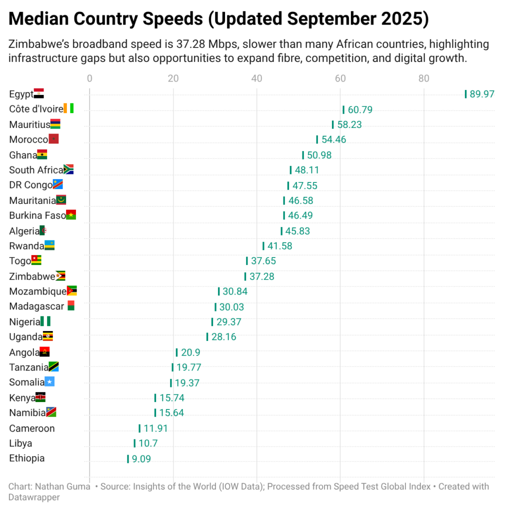 According to data by Speed Test Global Index, Zimbabwe’s broadband speed is 37.28 Mbps, slower than many African countries, highlighting not only infrastructure gaps but also opportunities to expand fibre, competition, and digital growth.