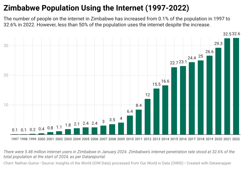 According to data by Our World in Data, the number of people on the internet in Zimbabwe has increased from 0.1% of the population in 1997 to 32.6% in 2022. However, less than 50% of the population uses the internet despite the increase.