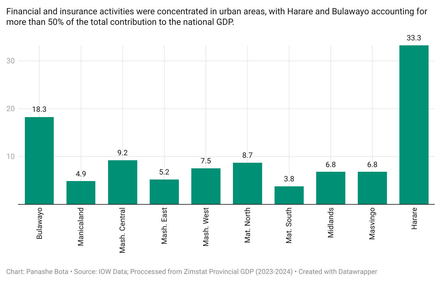 According to the Zimbabwe National Statistics Agency (Zimstat) data on Financial and Insurance Activities, Harare contributed 33.25% and Bulawayo 18.27%, giving a total combined contribution of 51.52% to the industry.