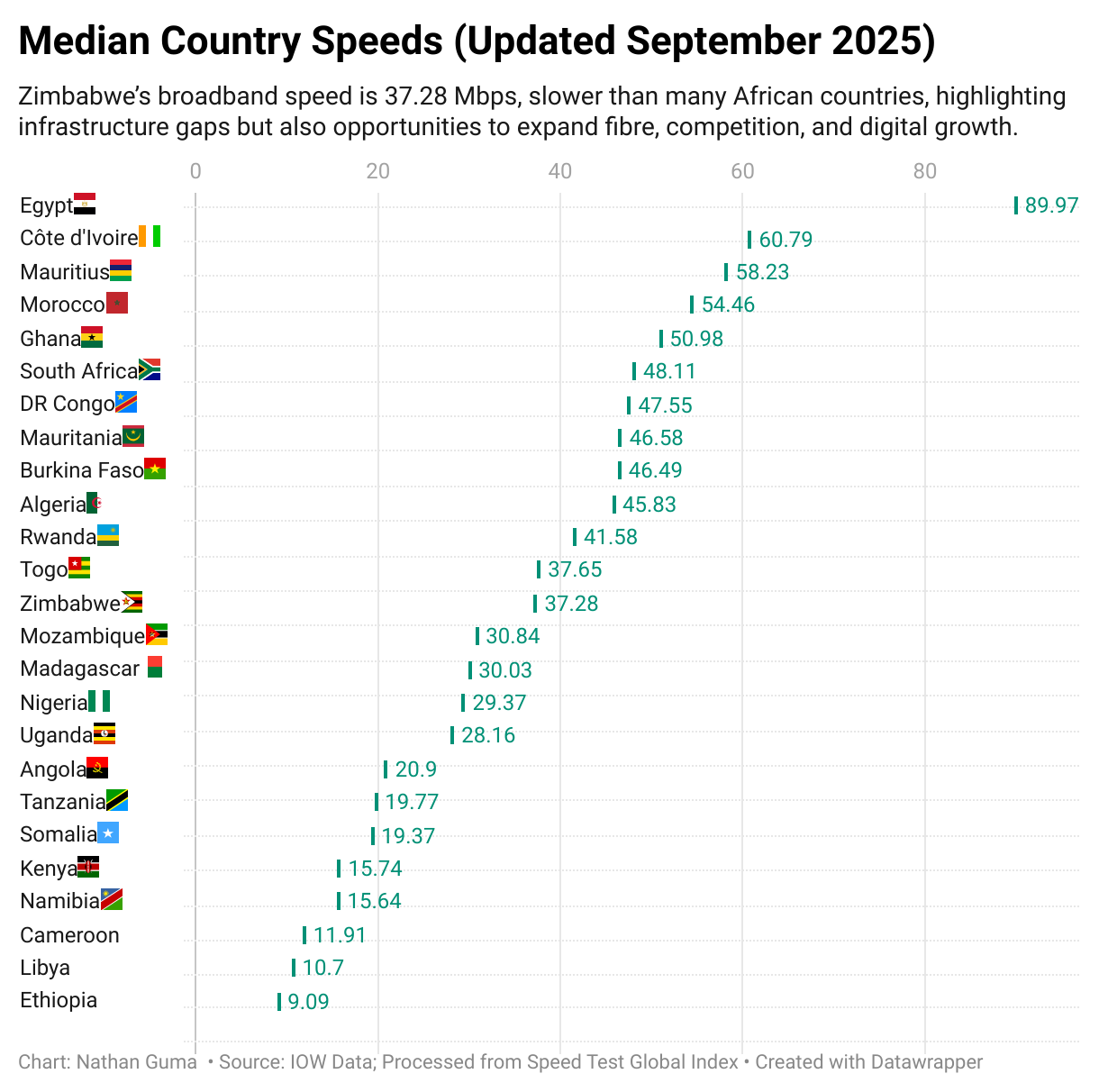 Egypt leads the continent with 89.97 Mbps, followed by Côte d’Ivoire (60.79 Mbps) and Mauritius (58.23 Mbps). In southern Africa, Ghana (50.98 Mbps) and Rwanda (41.58 Mbps) have made significant strides through consistent fibre expansion and private sector partnerships, lessons Zimbabwe could draw from.