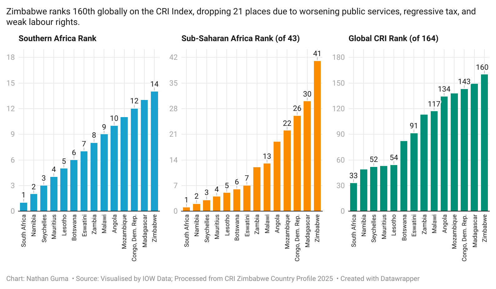 ZIMBABWE has recorded one of the steepest declines in the global 2025 Commitment to Reducing Inequality (CRI) Index, falling 21 places to 160th out of 164 countries, indicating how the country’s policies and actions to reduce inequality have worsened relative to other countries between 2022 and 2024.