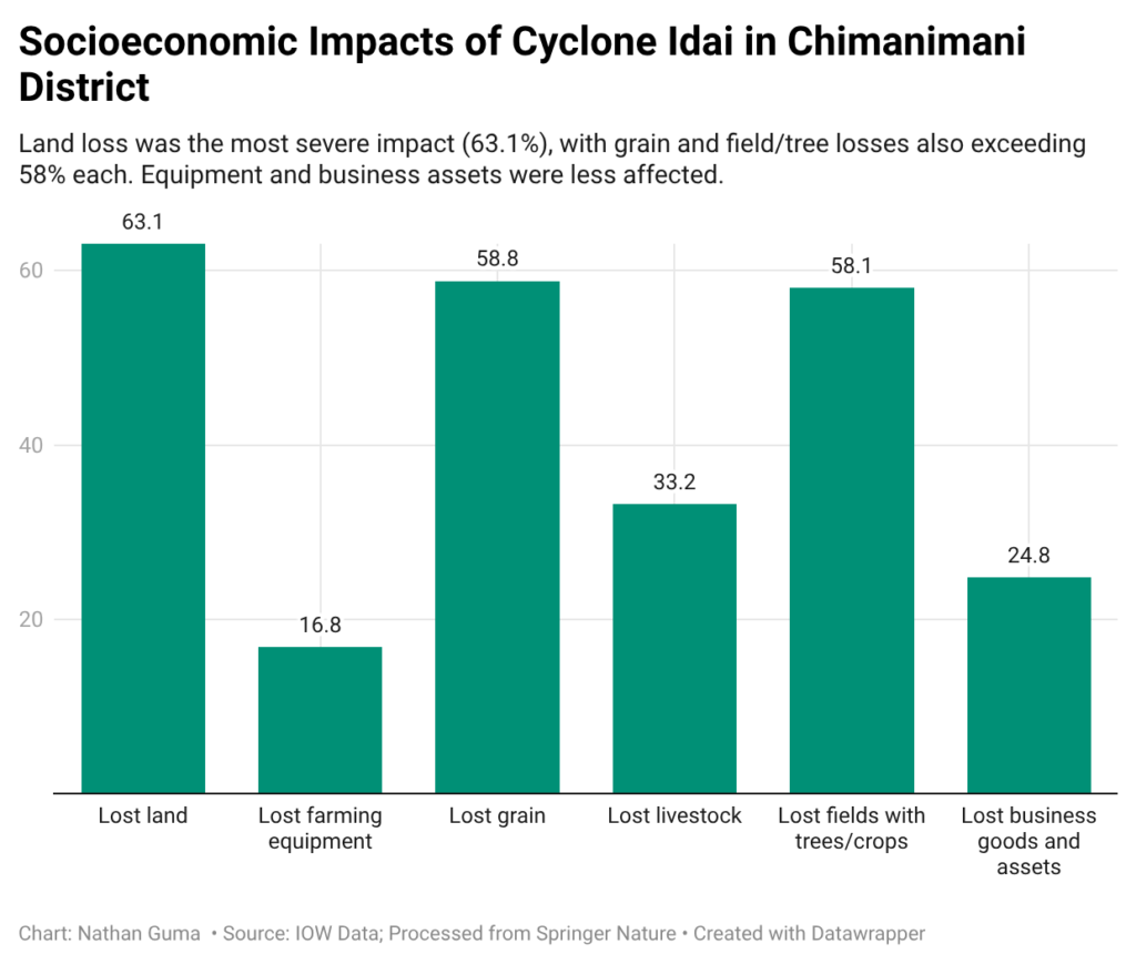 For instance, data by Srringer Nature shows that when Cyclone Idai hit Zimbabwe in 2019, land loss was the most severe impact (63.1%), with grain and field/tree losses also exceeding 58% each.